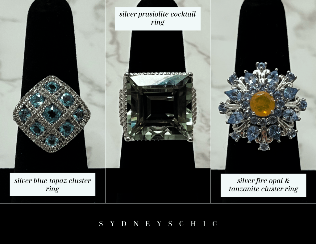 Make a note that just because a ring has a large stone doesn’t mean it’s out of your price point. Regardless of your budget, you can always find something nice when you know what to look for. I have gotten incredible deals on cocktail rings despite their carat size without breaking the bank. As I always say, it just depends on how hard you look and where. My best suggestion is to go online to Etsy and type in “Vintage estate cocktail ring” and see where the search takes you. If you really want something sparkling new and substantial, try Ross and Simons—an online jeweler selling both new and estate pieces. They have regular sales and I got the prasiolite and tanzanite rings pictured above from their store. They have many options with many different prices and lots of styles! Don’t blame me if you end up spending hours on there. It’s an abyss.