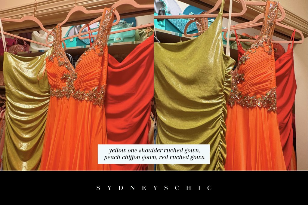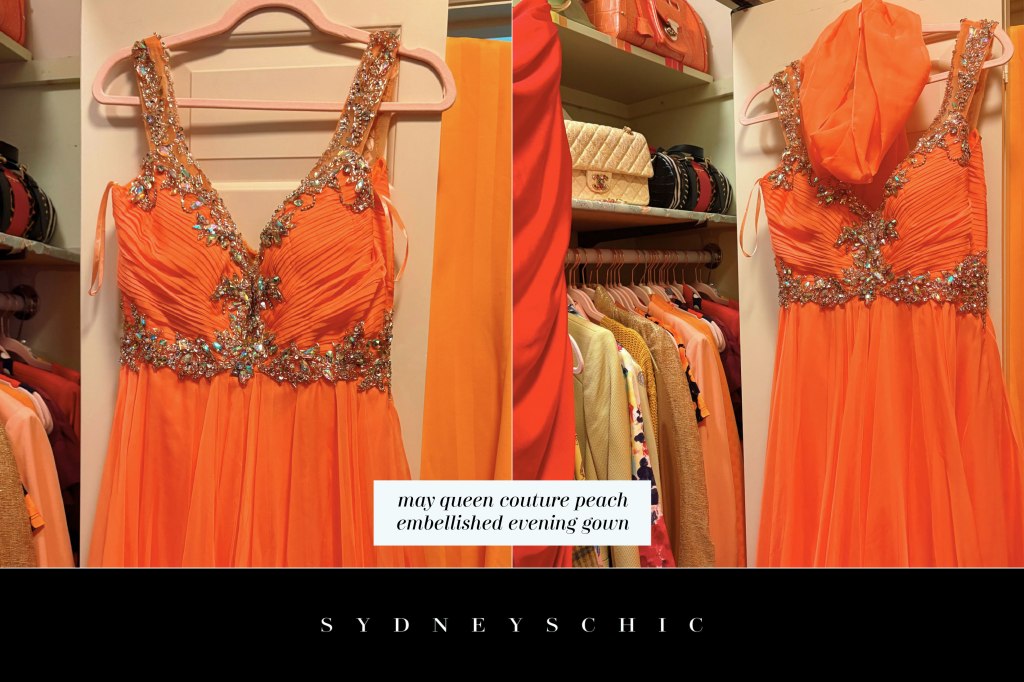 This year, after 4 months of searching the endless abyss of Ebay, I found the perfect dress—a peach chiffon evening gown by May Queen Couture. Oh, she was beautiful! In my mind, it shared the vibe of Marilyn Monroe’s orange dress that she wore as Lorelei Lee in Gentleman Prefer Blondes—one of the most iconic dresses in cinema! If you know, you know. This dress was just out of the budget that I set for myself but it was new with tags and included a matching evening shawl so with the money I saved having to get one separately, it all evened out because of girl math! I have always adored chiffon and was excited to wear this beautiful peach color. Please note that due to the lighting of my pictures, it looks more orange than it actually is in person. I have always adored the light weight feeling of chiffon for an evening gown and for what I paid, it honestly was not a bad deal because of the brand quality and potential for reuse that can sometimes be lost with the purchase of a cheaper gown.