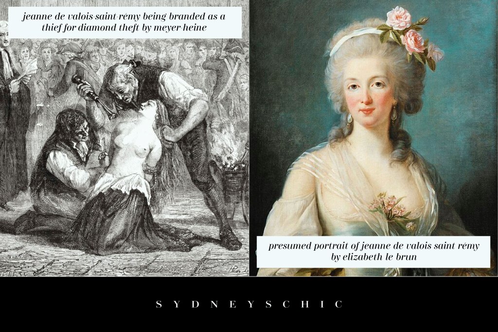 Jeanne de Valois Saint Rémy being branded for theft. Engraved by Meyer-Heine after Hippolyte de la Charlerie via wiki commons on the left side.
