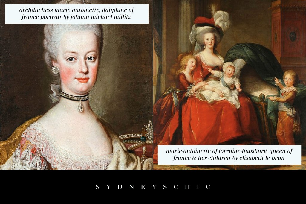 Archduchess Marie Antoinette, Dauphine of France portrait by Johann Michael Millitz in 1770 via wiki commons on the left side.