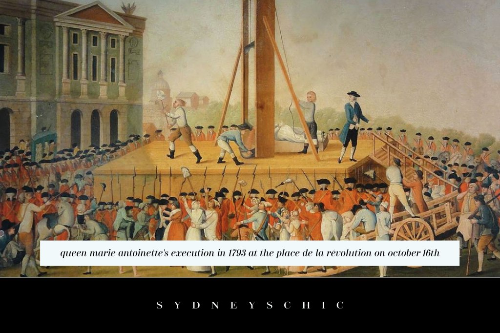 Marie Antoinette’s execution in 1793 at the Place de la Révolution via wiki commons in the single image.