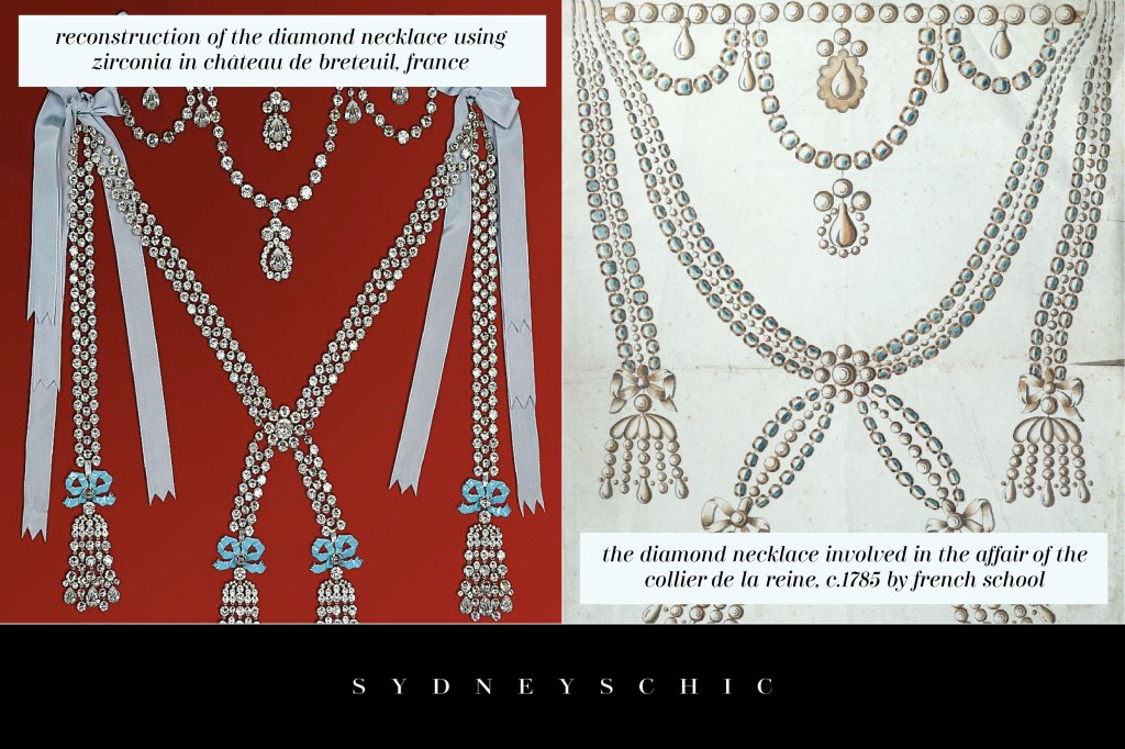 Reconstruction of the diamond necklace using zirconia in Château de Breteuil, France via wiki commons on the left side.