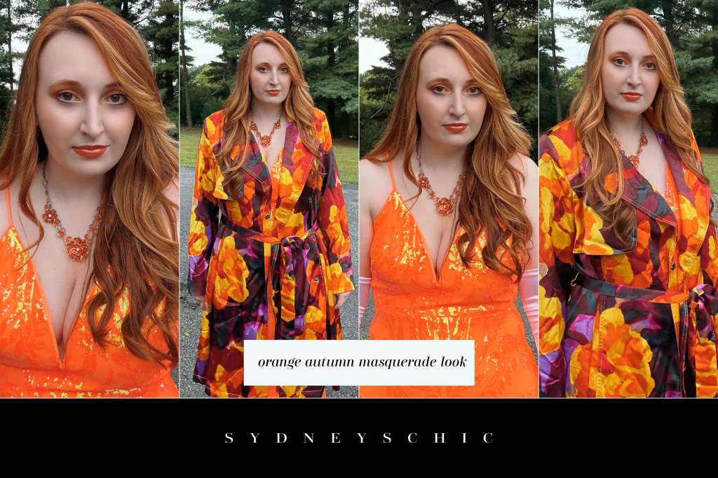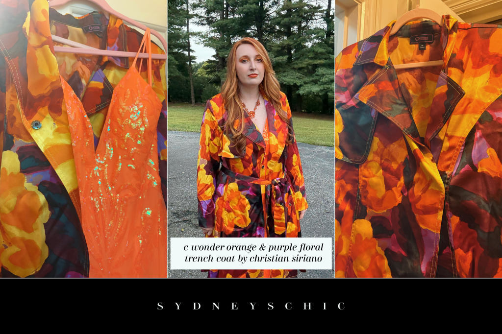 I knew that I didn’t want an evening wrap because of the season, temperature, and weather so I decided on a reliable trench coat. Again, I struggled to find just the right color until I remembered this very specific coat from Christian Siriano’s C Wonder brand that had every color of orange imaginable woven into it’s print. The satin fabric made it luxurious enough for evening wear and I was sold! That’s what I got and you can see it pictured above.