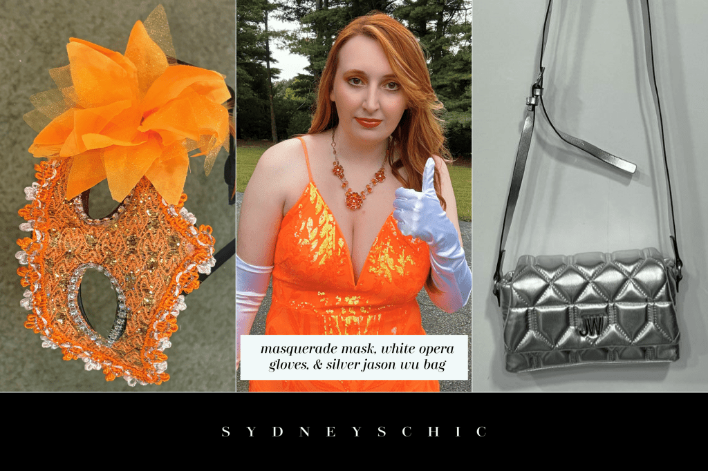 Finding a mask was one of the hardest parts of this outfit because this dress is such a distinctive shade of orange. I couldn’t decided whether I wanted to honor my Venetian roots with a traditional stick mask or not but in the end I went with ribbon. I picked a metallic lace mask from the amazon for $8.99 with several different shades of orange in the hopes that one would match. I didn’t feel like it was a perfect fit but it was a good one and the silver tied into the rest of my outfit.
