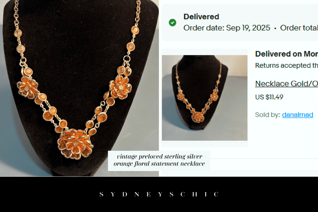 After several rejects, I found this perfect unbranded statement necklace for $7.99 that came to $11.49 with local shipping costs. Made of sterling silver that desperately needed a good cleaning and orange gems arranged into flowers, it was everything that I was looking for! The bezel shaped stones were such a lovely touch that made this necklace appear much more expensive than it actually was and caught the light beautifully.