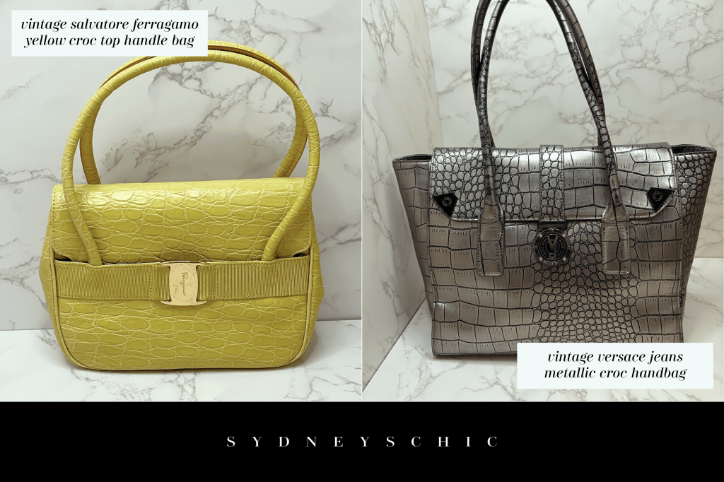 We’ve discussed how leather ages well but another tip that I have for shopping vintage is to search for textured handbags with textured leather such as ostrich, quilted, snakeskin, or crocodile. This excludes faux furs and pony hair which are in a different category and do not belong here due to their difficult maintenance. A lot of people notice that many of my vintage bags are particularly those featuring crocodile or alligator styling. They assume that it’s just a style preference but it’s actually not—it’s a wisely chosen investment choice based on how vintage bags age.