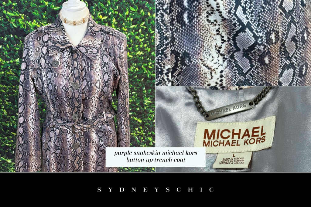 This week’s post shines a spotlight on another truly fabulous fashion find that I was lucky enough to snag—all in the name of a wonderful cause. Shopping to benefit causes is not something new around here especially if you’ve read my other posts starting with my first one here. More recently, I wrote about the purple Alberto Makali gown that I bid on—and won—from Goodwill Central Coast but during a recent shopping excursion on Ebay, I stumbled upon a stunning designer trench coat that immediately caught my eye. Designed by beloved fashion icon, Michael Kors, it’s purple snakeskin fabric exudes timeless elegance. It’s the kind of outerwear that effortlessly elevates any outfit, whether I’m dressed up for an event or keeping it casual on the weekends.