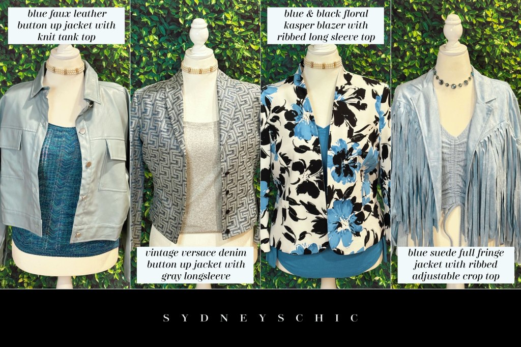 The first look pictured features the baby blue faux leather jacket that we discussed earlier. To style it, I decided to create dimension by combining the smooth texture of leather with a knit tank top underneath. This is one of my favorite textile pairings and it’s very easy to wear! The tight knit tank top that I chose to put under this jacket has shades of blue, green, and teal woven into it’s multicolor yarn. These colors make the pale blue jacket pop in a way that wouldn’t work with just another solid color while still keeping with the blue color palette. I would wear this look with blue jeans or a skirt depending on where I was headed. For jewelry, a natural or raw stone like kyanite, aventurine, chalcedony, or even moonstone would be a nice touch.
