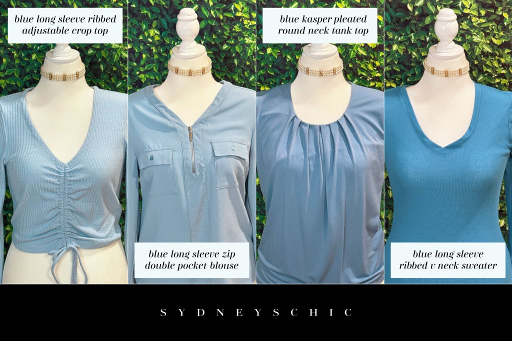 Pictured above, I have four shirts that fall into the cool blue category, showcasing a stunning spectrum of shades that perfectly capture the essence of this color trend. Ranging from the lightest to the darkest hue, these shirts beautifully illustrate the versatility and depth of blue tones. The lightest shade, a soft sky blue, exudes a sense of serenity and calmness, while the next shade, a gentle baby blue, adds a touch of sweetness and innocence. Moving towards the medium tone of blue, the third shirt features a muted periwinkle that puts a steely spin on pastel to convey confidence and finally, the darkest shade, a deep cornflower blue, adds a pop of color and sophistication. Together, these four shirts demonstrate the range and nuance of pale blue, highlighting the many ways this trend can be styled and worn to create a variety of looks and moods no matter the occasion.