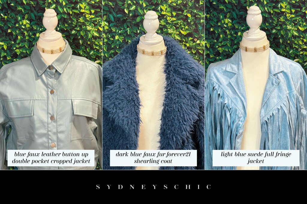 Pictured above, I have three examples of statement pieces matching the pale blue trend. These coats are all different with a range of fabrics and hues. The first is a light blue faux leather cropped jacket with double chest pockets and a collar. The crisp lines in the jacket make it visually interesting to the eye and give it more dimension than just the leather texture. This jacket also features round, silver buttons to match the cool tones that we’re discussing in this post. Of the three jackets, this first jacket is the most neutral in color being the closest one gray.