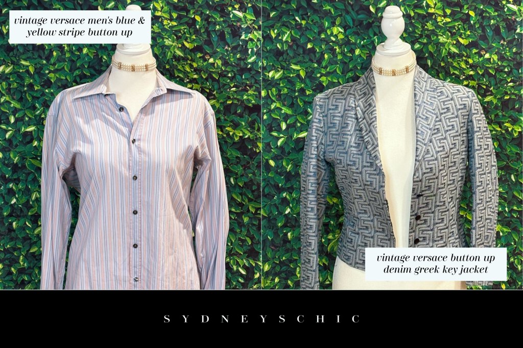 In the second picture, you’ll find my prized vintage Versace jean jacket, an iconic piece that exudes effortless style. This jacket has matching pants to make a full suit. The button up design paired with the classic denim textile adds casual and relaxed air to the piece, making it perfect for many different types of venues. What sets this jacket apart, however, is the intricate detail of white Greek key style thread woven throughout the fabric, a signature element that is unmistakably Versace. This subtle yet striking touch adds a level of high fashion flair that could only come from their brand. It’s not a simple denim wardrobe staple but rather a statement piece that reflects the iconic Italian fashion house’s commitment to bold design. Overall, the combination of classic style, premium denim, and distinctive Versace branding makes this vintage jacket a true treasure in my wardrobe.