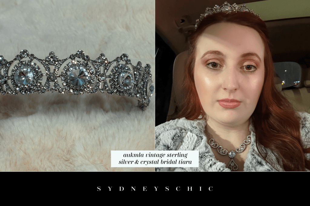 The tiara that I chose is a vintage one by Aukmla. It’s sterling silver and features a low diadem or kokoshnik style profile that fits the regency standard of a lower crown. This tiara features sparkling rhinestones, curved arches, and floral details with shorter, rounded points. I purposefully wanted something that not only had intricate metalwork to match the necklace but would follow the botany or floral theme that I assigned to myself when I first started this look. The tiara matches the rose detailing in my coat as well as my clutch bag.